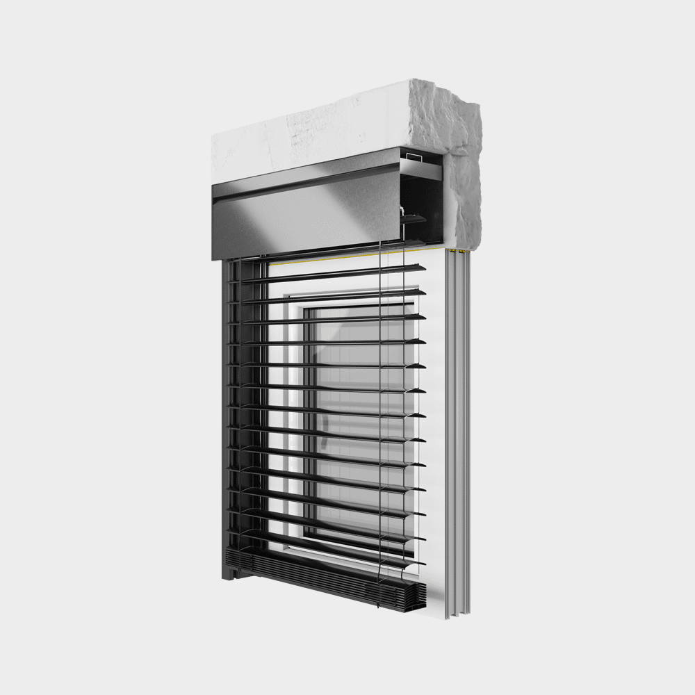 Ein modernes System mit einem Alu-Sturzkasten, erhältlich in einer Auf- & Unterputz-Version- Die einfache Ausführung und die charakteristische Biegung an der Außenwand des Kastens bilden eine interessante Alternative zu anderen Systemen.